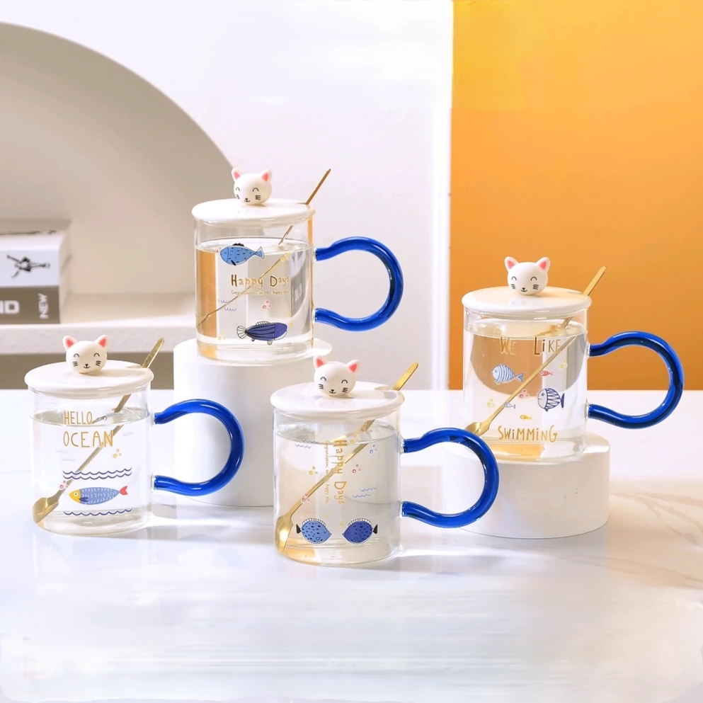 Esta taza de vidrio destaca por su diseño alegre y delicado, con ilustraciones de gatitos y peces que aportan un estilo fresco y encantador. El asa en color azul crea un contraste llamativo con el vidrio transparente, dándole un toque moderno y divertido.
