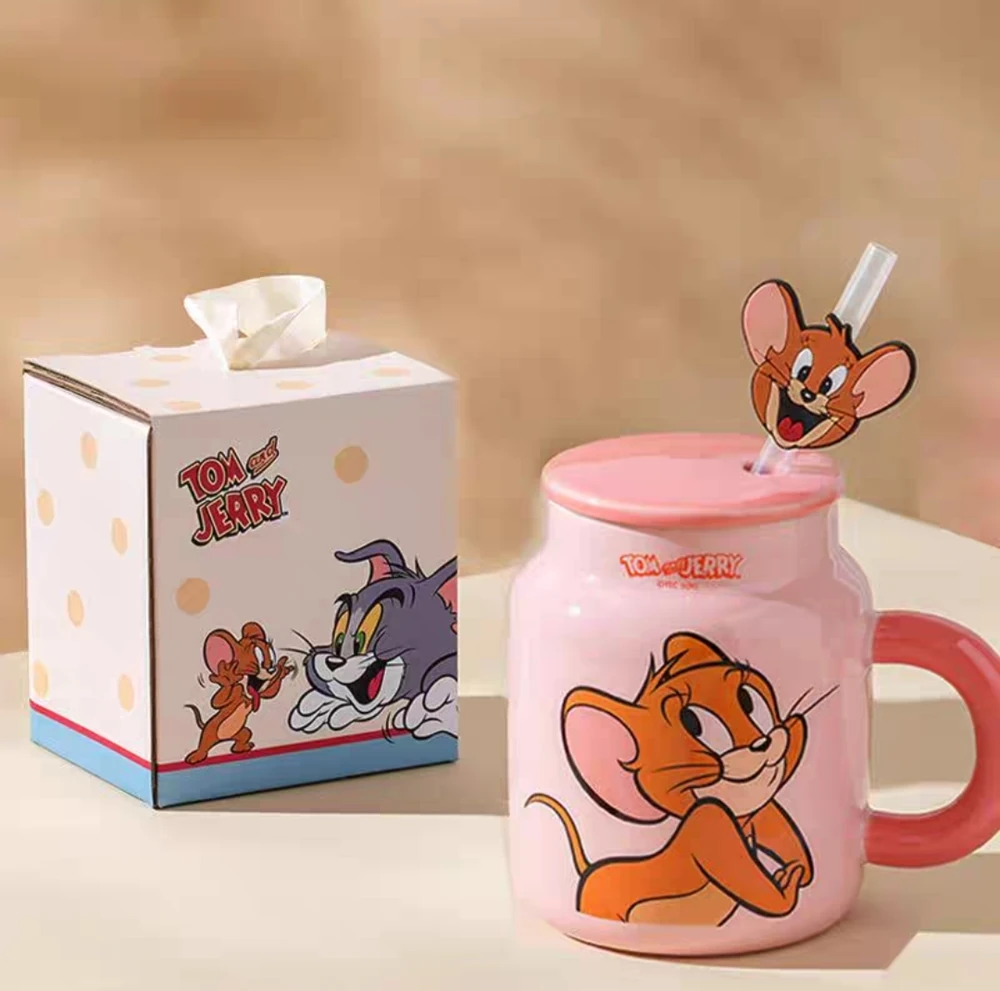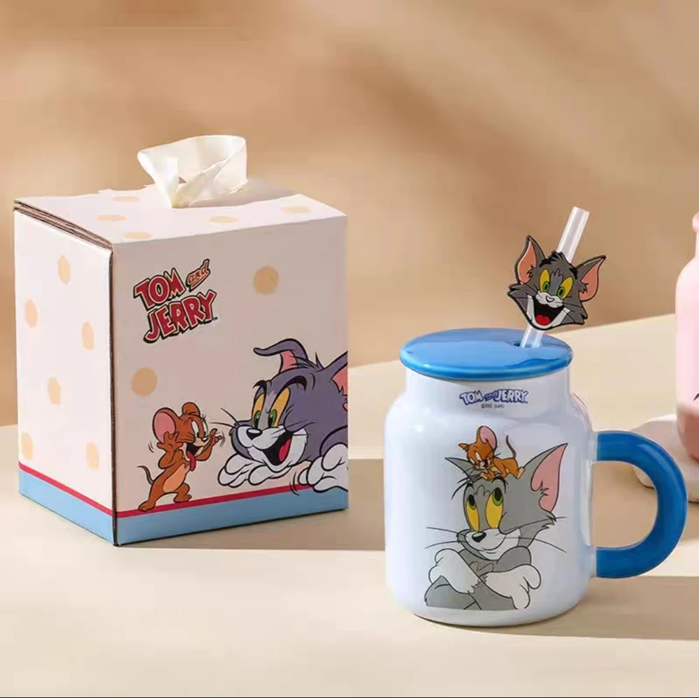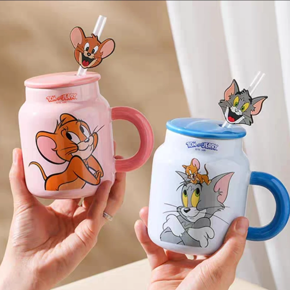 Taza de cerámica con ilustraciones detalladas de Tom y Jerry, inspiradas en escenas clásicas de la serie animada. Cada diseño presenta al personaje principal en primer plano, con colores suaves y acabados brillantes que resaltan los rasgos y expresiones características.