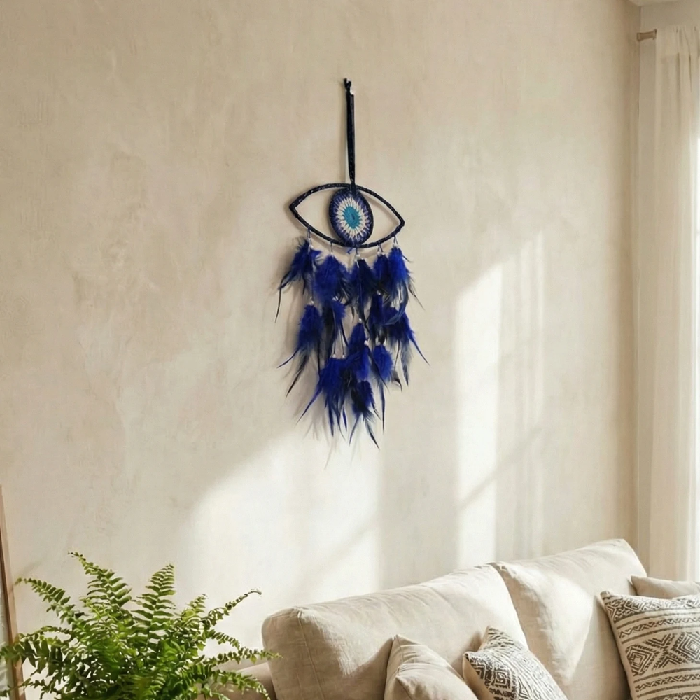 Atrapasueños Decorativo con Forma de Ojo – Protección y Estilo Sumá un toque místico y llamativo a cualquier ambiente con este atrapasueños artesanal en forma de ojo, un símbolo asociado a la protección y las buenas energías. Su diseño original combina un tejido central detallado con plumas en tonos azules profundos, creando una pieza decorativa que no pasa desapercibida y realza cualquier espacio. Ideal para colgar en dormitorios, livings, locales comerciales o espacios holísticos, este atrapasueños no solo decora, sino que transmite armonía y personalidad. Es un producto muy buscado por su estética boho y su significado simbólico, perfecto para clientes que valoran la decoración con intención. Un artículo que se vende solo por su impacto visual. ✨ Aprovechá la oportunidad de sumar a tu catálogo un producto diferente, con excelente salida y alto valor percibido. Ideal para reventa en tiendas de decoración, regalos o bazares. Características principales: