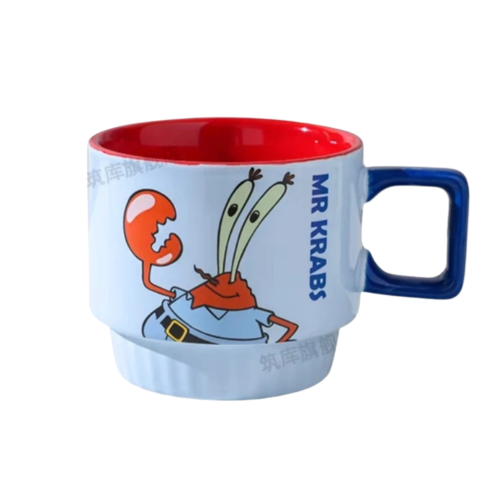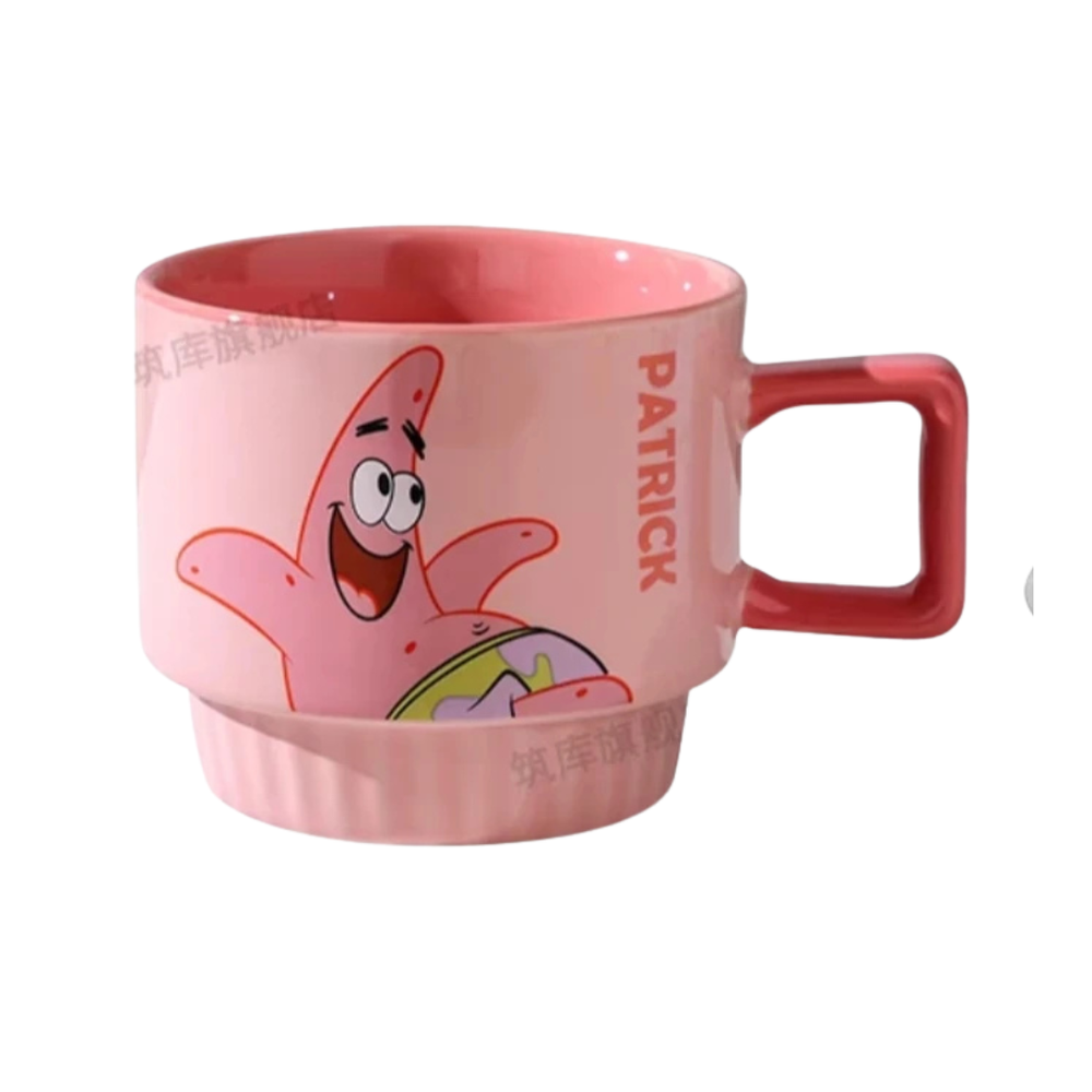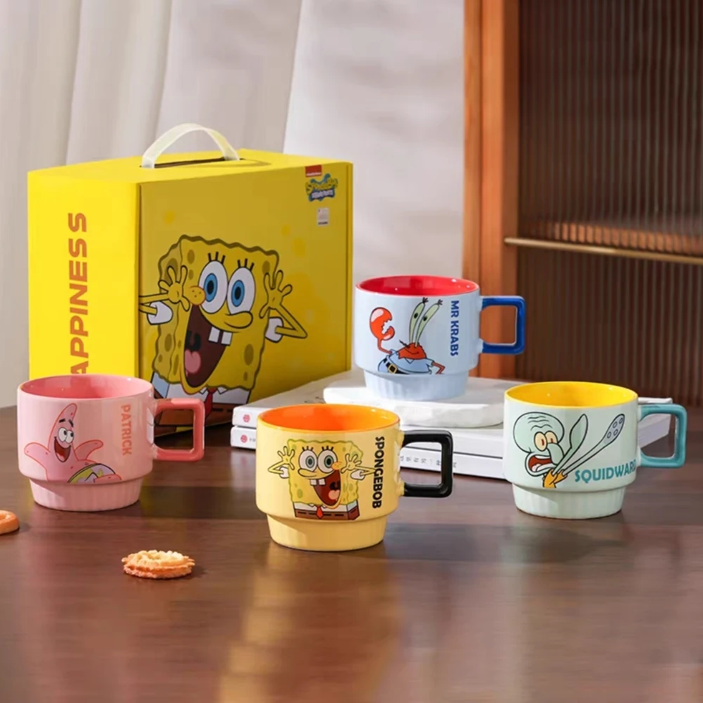 Tazas de cerámica apilables con diseño de Bob Esponja presentan ilustraciones coloridas de personajes reconocidos de la serie, como Bob Esponja, Patricio, Calamardo y Don Cangrejo. Cada modelo combina gráficos llamativos con interiores en colores intensos, logrando un conjunto visual atractivo.