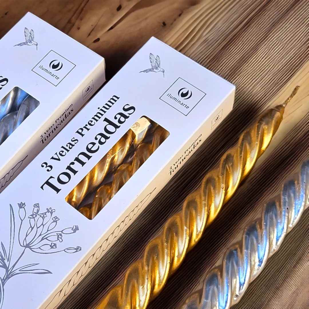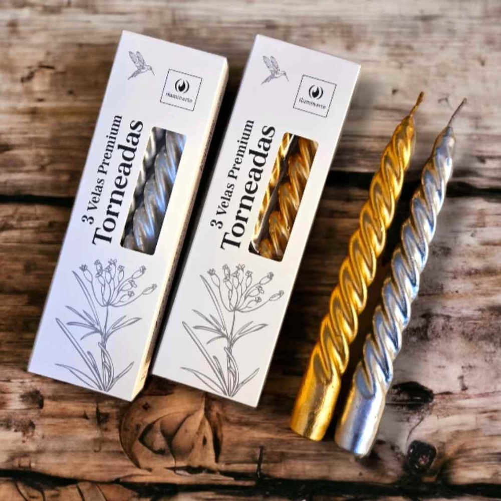 El set incluye tres velas del mismo color, presentadas en una caja individual con ventana, lo que permite apreciar el diseño sin necesidad de abrir el empaque. Disponibles en tonos metalizados como dorado y plateado, son una opción decorativa que combina fácilmente con distintos estilos de decoración.
