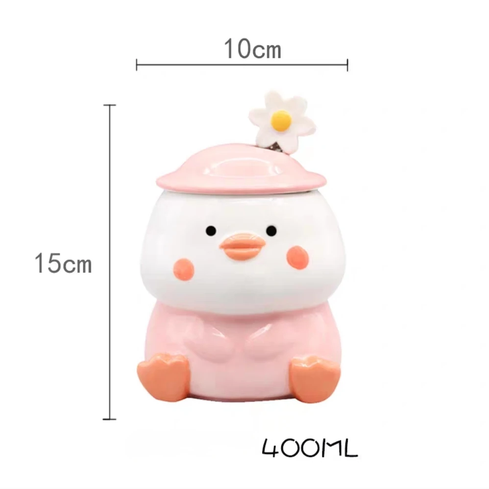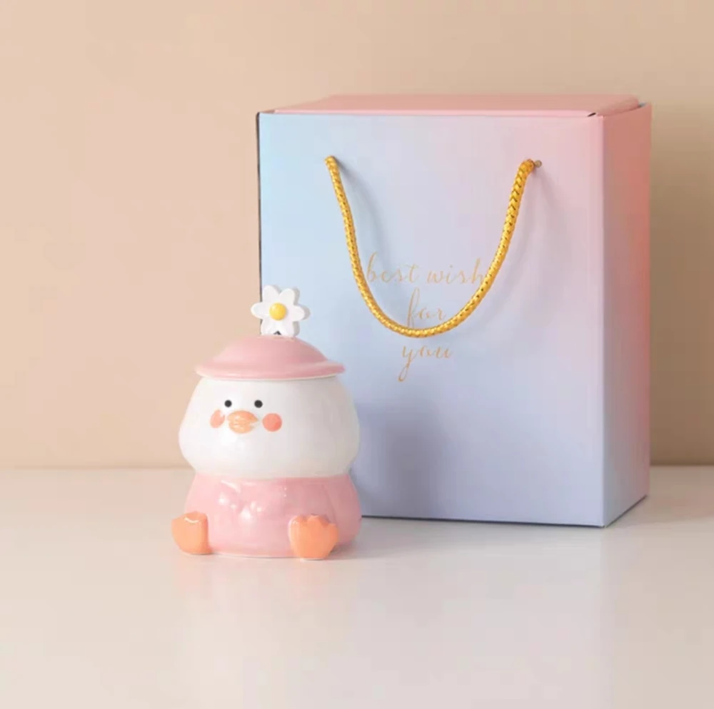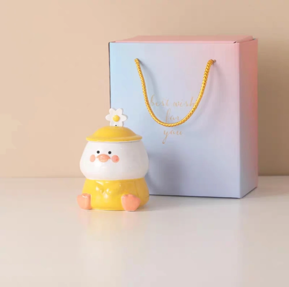 Esta taza de cerámica con diseño de pato y flor presenta una figura simpática y delicada, con forma redondeada y expresión tierna. El diseño muestra un patito sentado, con mejillas rosadas y una pequeña flor en la parte superior, lo que le da un aspecto dulce y decorativo.