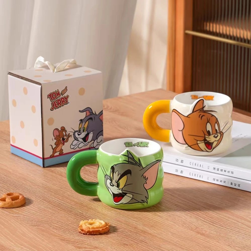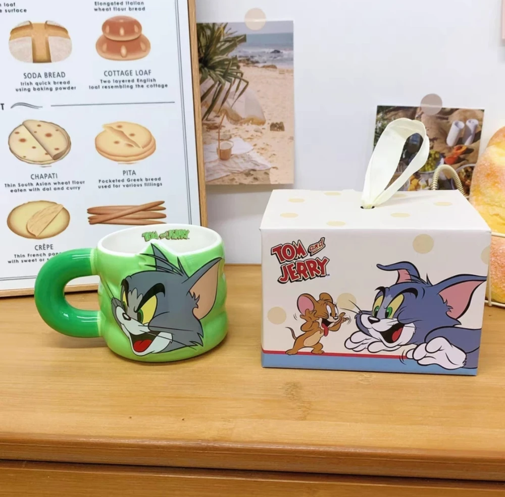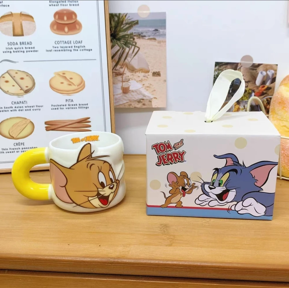 Esta taza de cerámica con diseño de Tom y Jerry cuenta con ilustraciones grandes de los personajes clásicos, mostrando expresiones alegres y reconocibles. El dibujo ocupa buena parte del frente de la taza y le da un estilo divertido y llamativo.