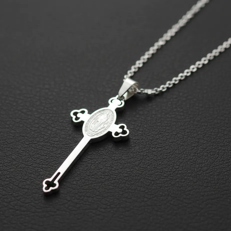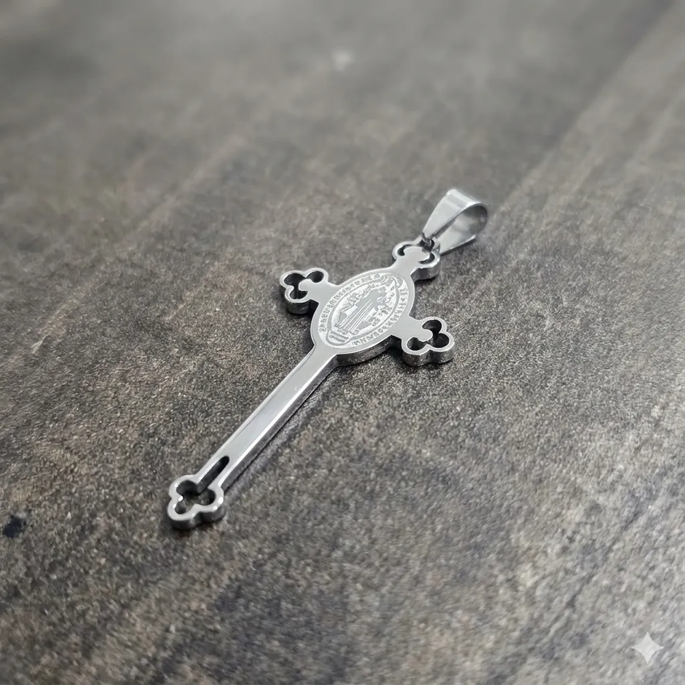 Este elegante collar con Cruz de San Benito trébolada es una pieza que combina protección espiritual, diseño clásico y máxima durabilidad. Fabricada en acero quirúrgico, ofrece un brillo sofisticado, alta resistencia al uso diario y no se oxida ni se pone negra, ideal para clientes que buscan un accesorio confiable y de larga vida útil.
