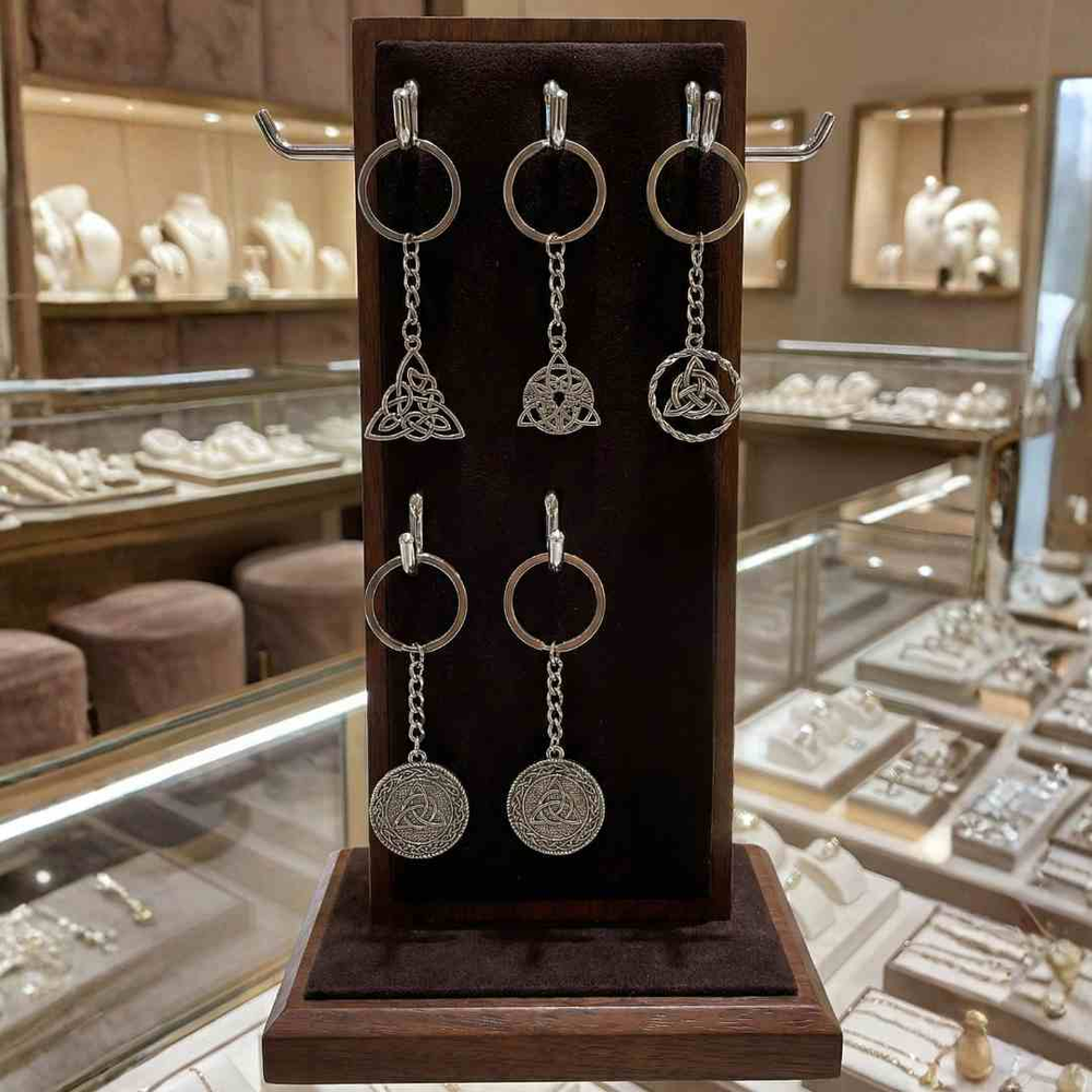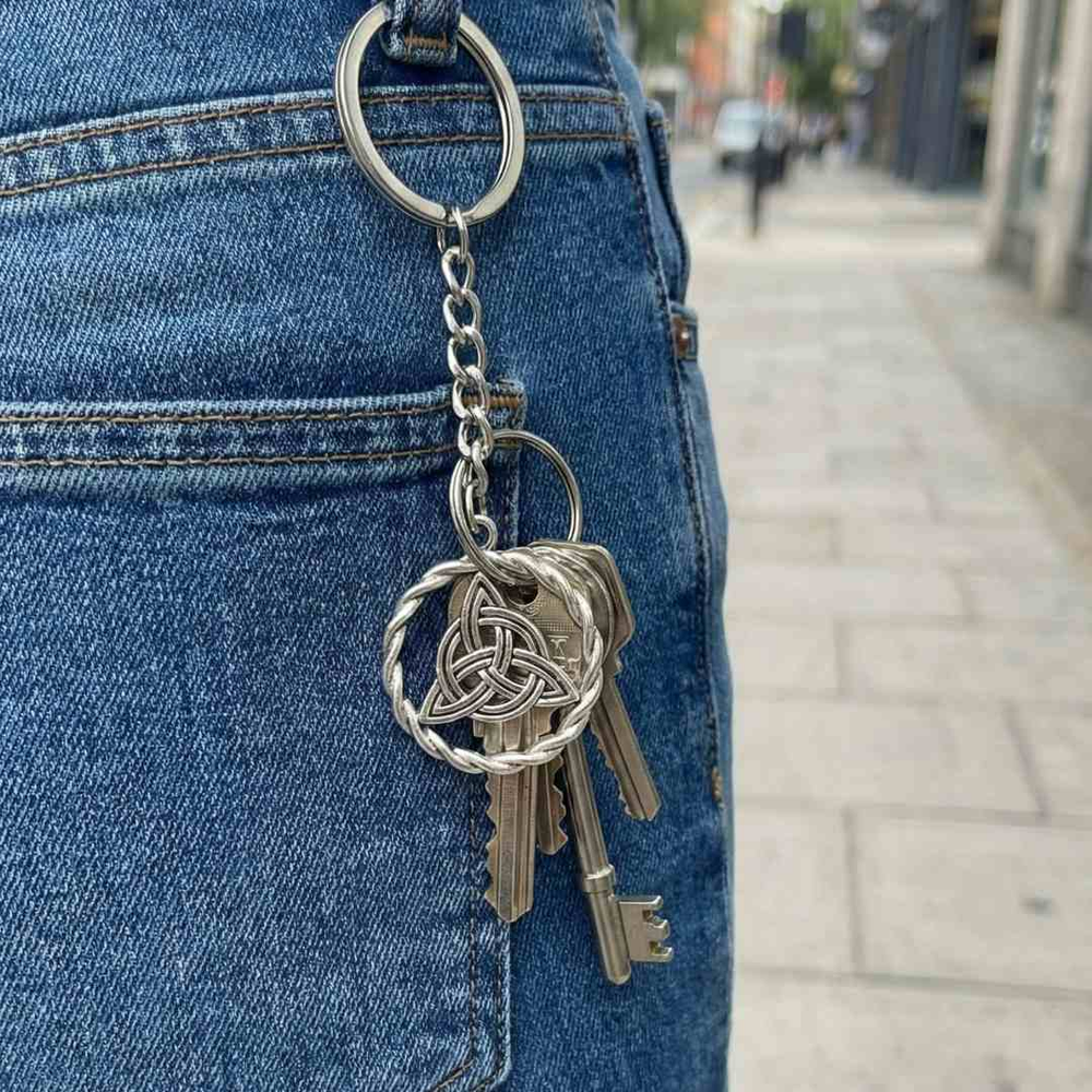 Llaveros metálicos con diseño de trisquel, símbolo celta de forma espiral. Cada llavero tiene argolla redonda resistente y cadena corta que une el dije, permitiendo un uso cómodo en llaves, mochilas o bolsos.