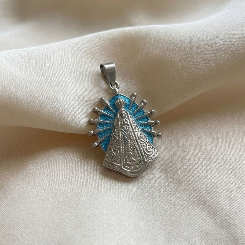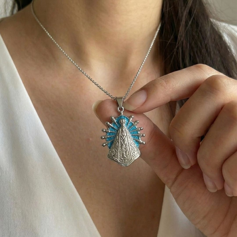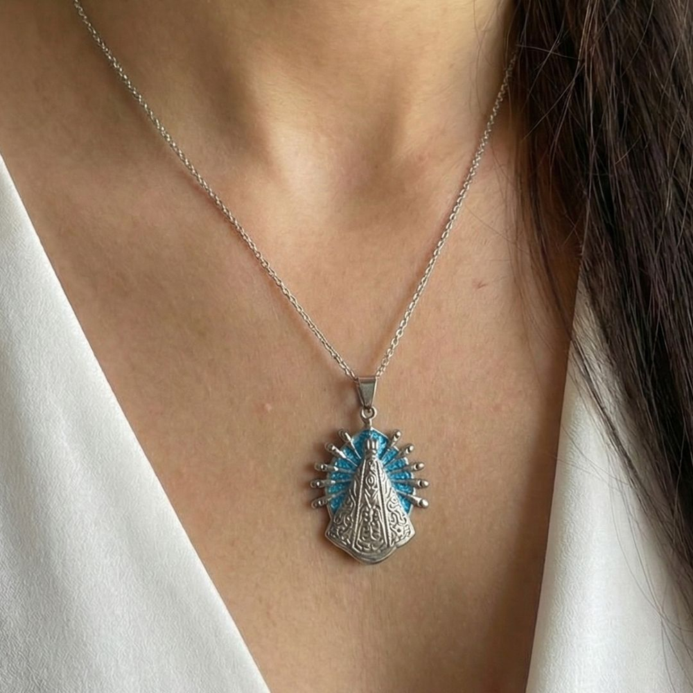 Dije de acero con imagen de la Virgen de Luján, con relieve trabajado y fondo en color celeste que acompaña la figura. El diseño muestra la silueta clásica de la Virgen con detalles marcados en el manto y un halo con terminación radial.