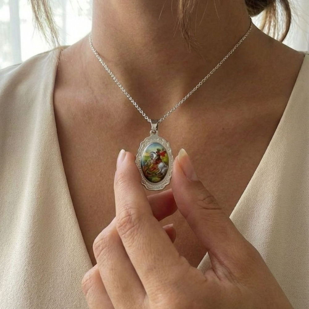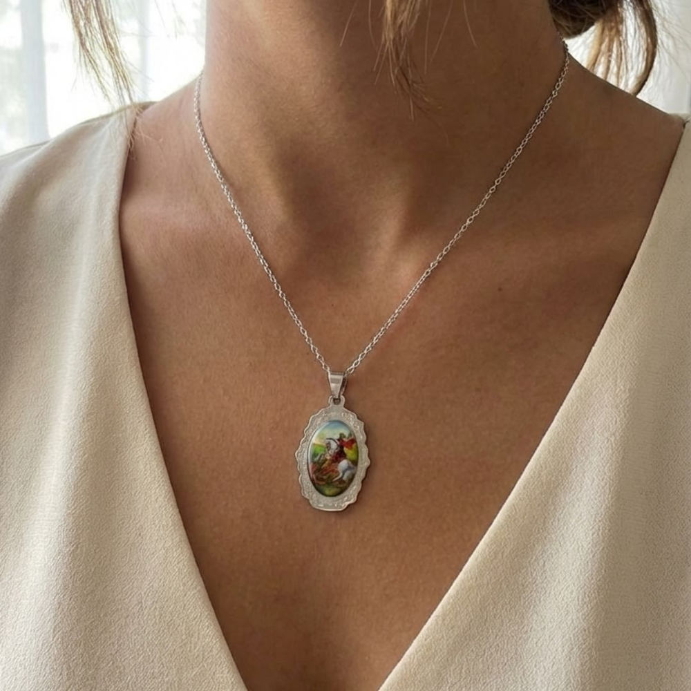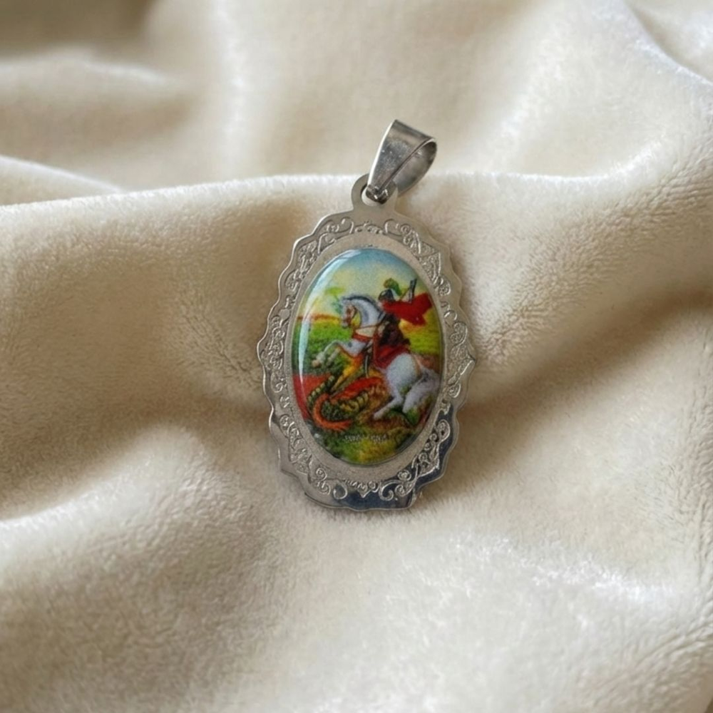 Dije de acero con imagen de San Jorge, representado a caballo en plena lucha, con imagen a color protegida por un marco plateado con detalles grabados. El formato ovalado le da un estilo clásico y fácil de combinar.