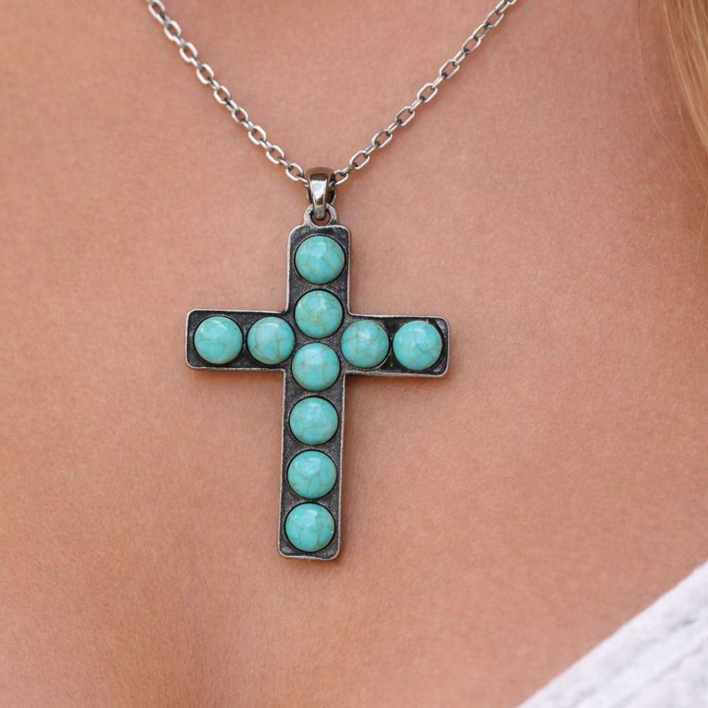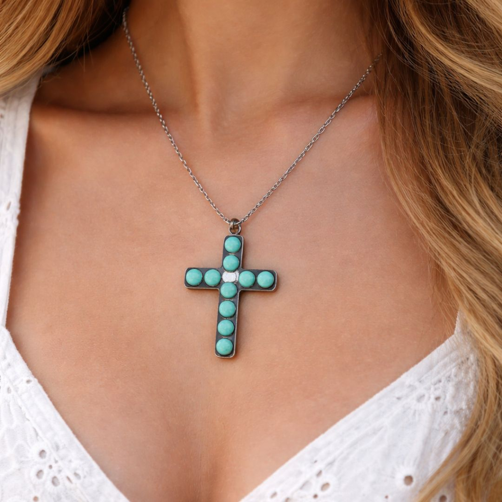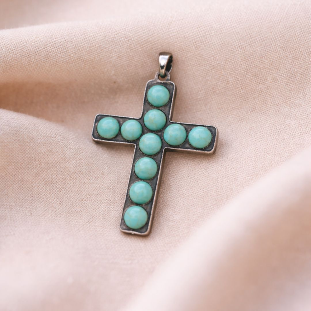 Dije en forma de cruz, con piedras color turquesa colocadas de manera uniforme sobre una base plateada. El contraste entre el turquesa y el metal le da un look llamativo pero fácil de usar todos los días.