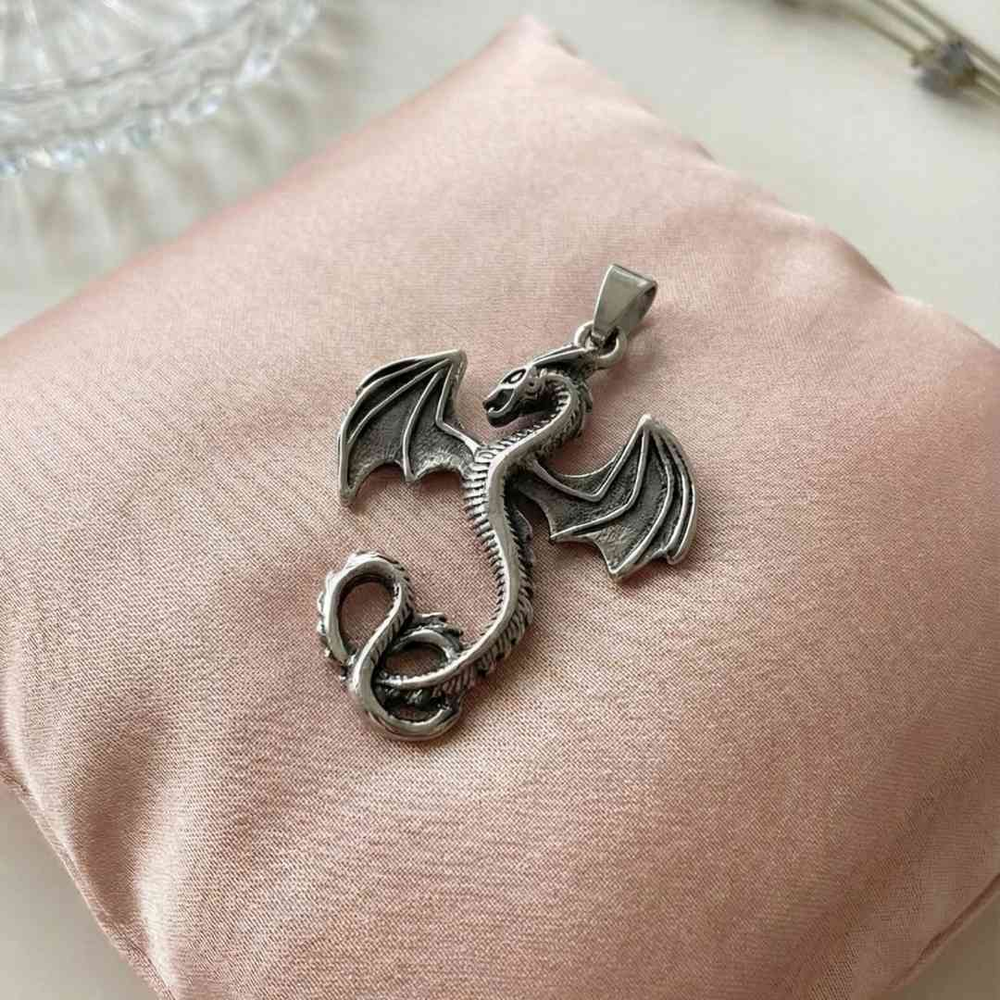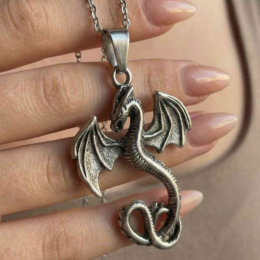 El trabajo del metal resalta los detalles del dragón, dándole una apariencia firme y definida. Las alas tienen relieve y textura, y el cuerpo mantiene una forma estilizada que lo hace llamativo sin ser exagerado.