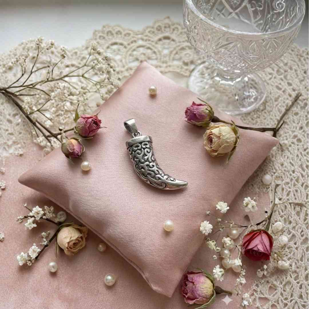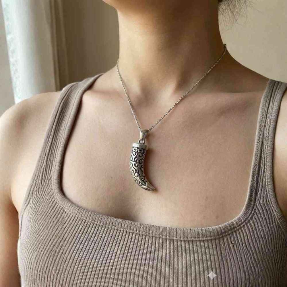 Dije con forma de cuerno, hecho en acero quirúrgico color plateado. Tiene un diseño curvo con grabados en relieve que recorren toda la superficie, dándole un estilo marcado y claro.