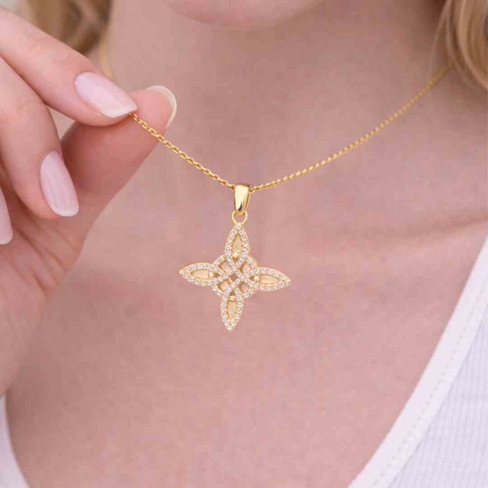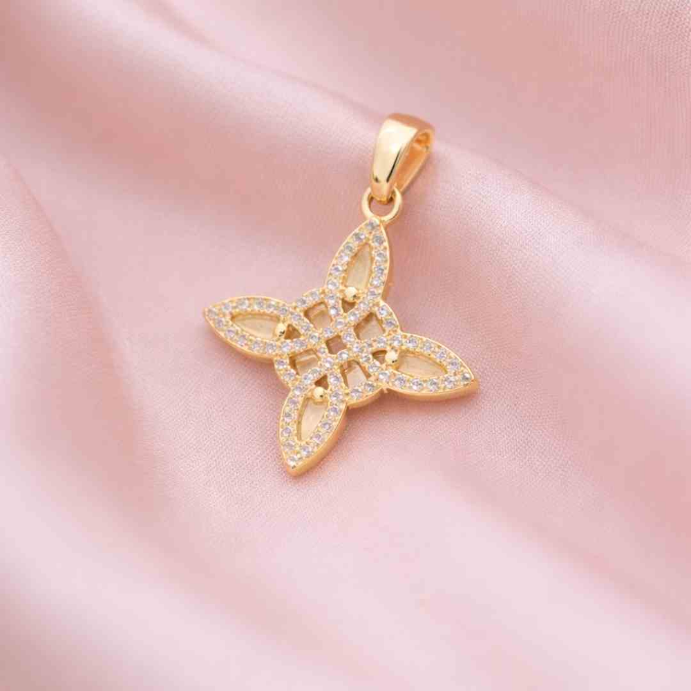 Este dije Nudo de Bruja en bronce dorado es una pieza refinada que combina fuerza simbólica y brillo sofisticado. Su diseño geométrico, realzado con detalles brillantes, lo convierte en un accesorio llamativo y de alto valor percibido, ideal para clientes que buscan amuletos con significado y estética cuidada.