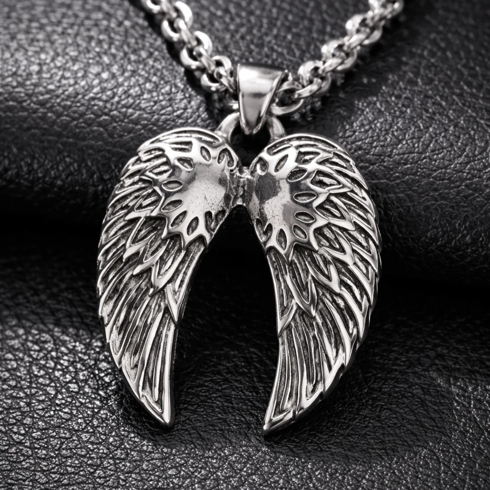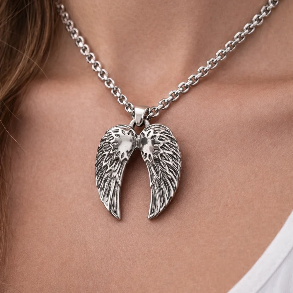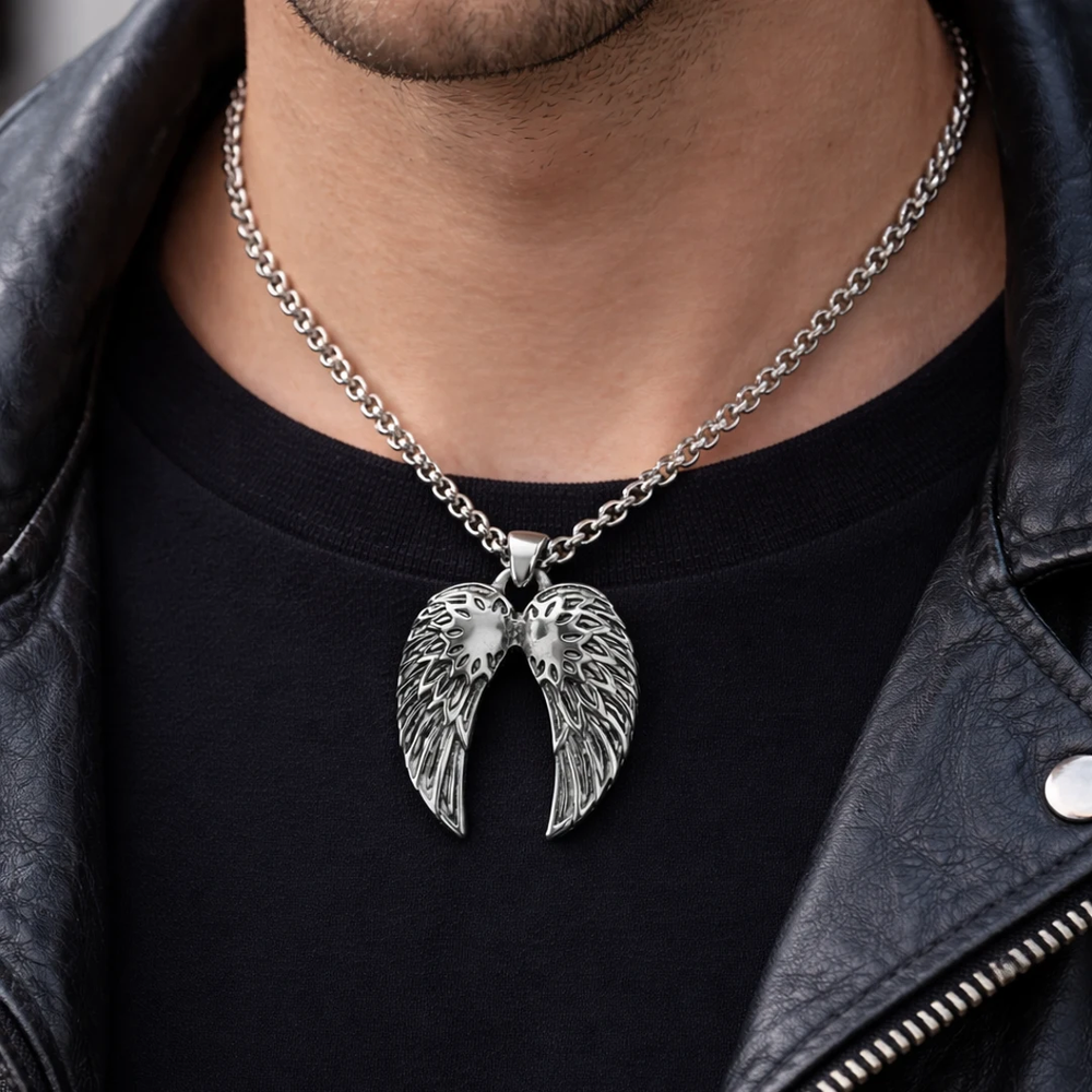 Este dije de alas destaca por su diseño detallado y su acabado metálico de alto brillo, transmitiendo fuerza, protección y libertad. Fabricado en acero quirúrgico, es una pieza resistente, duradera y pensada para el uso diario sin perder su apariencia original. Ideal para quienes buscan un accesorio con significado y estilo atemporal.