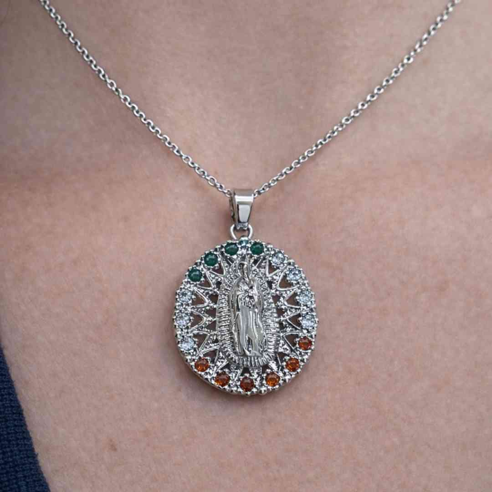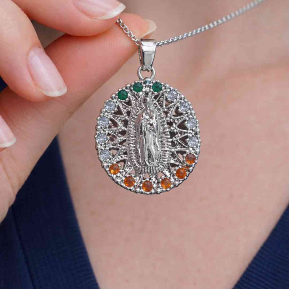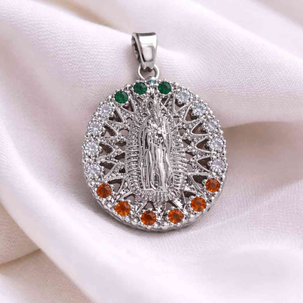 Impactante y llena de significado, esta medalla de la Virgen de Guadalupe con strass de color combina fe, brillo y elegancia en una pieza única. Su diseño circular presenta un delicado trabajo calado con strass multicolor que realzan la figura central, logrando un acabado llamativo y de gran valor percibido.