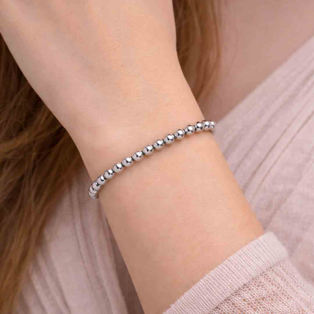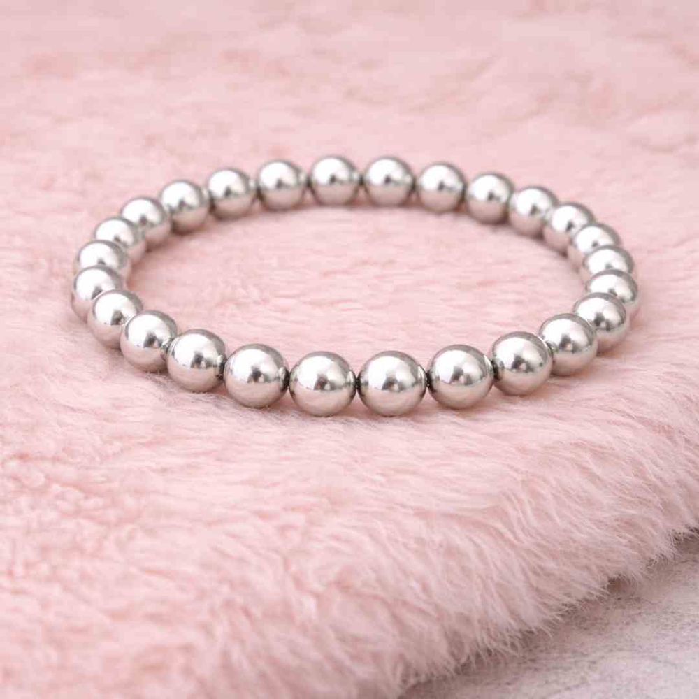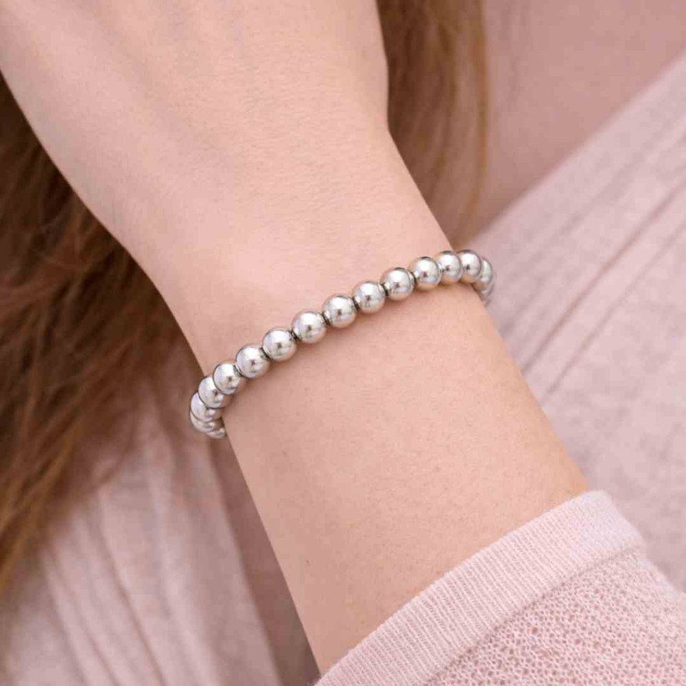 Clásica, elegante y versátil, esta pulsera de perlas plateadas es un básico infaltable en cualquier colección de accesorios. Su diseño minimalista con esferas pulidas de acero quirúrgico aporta un look sofisticado que se adapta tanto a estilos casuales como formales.