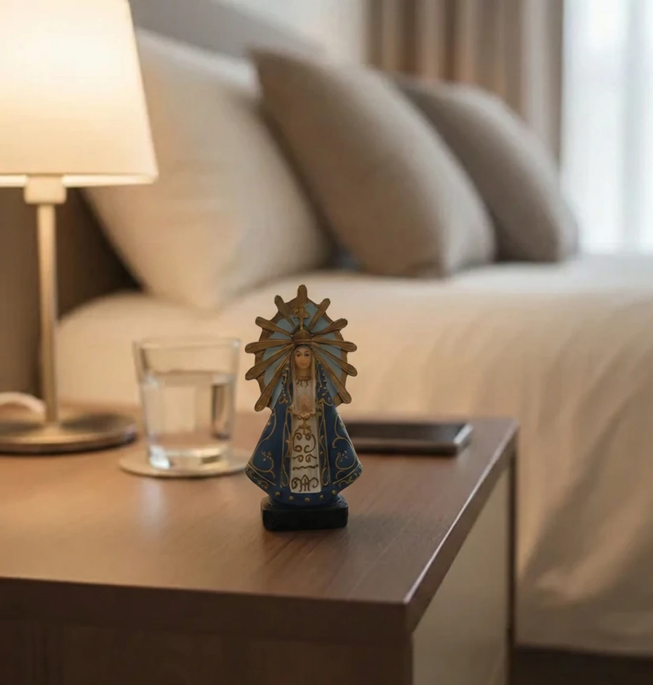 Esta imagen de la Virgen María destaca por su diseño delicado y elegante, ideal para quienes buscan un objeto de fe que también aporte calidez y armonía a los espacios. Su manto azul con detalles dorados y la corona en forma de rayos le dan una presencia imponente pero serena, perfecta para mesas de luz, altares, estanterías o rincones especiales del hogar.