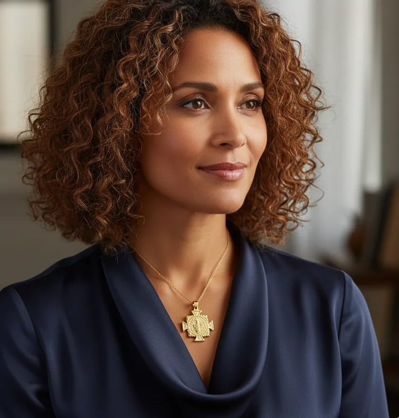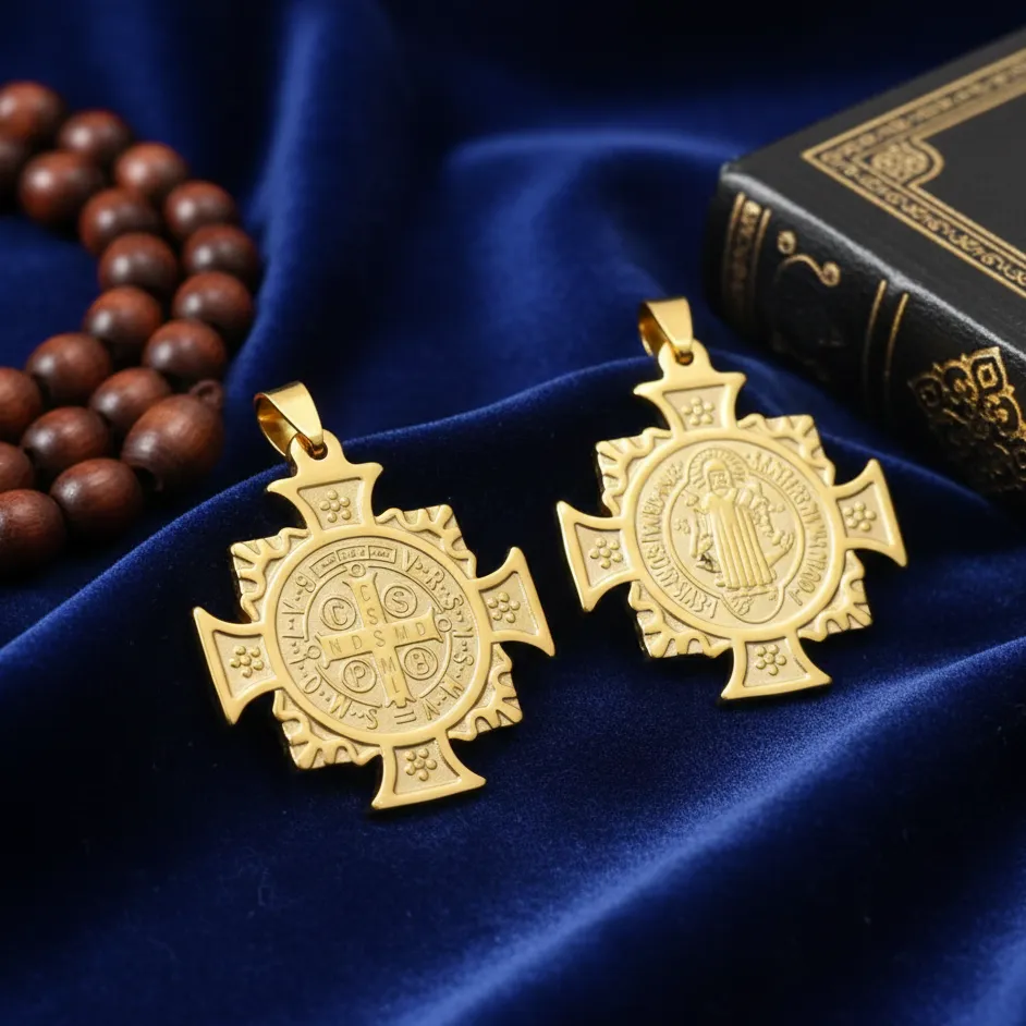 Dije Cruz de San Benito – Acero Quirúrgico Dorado