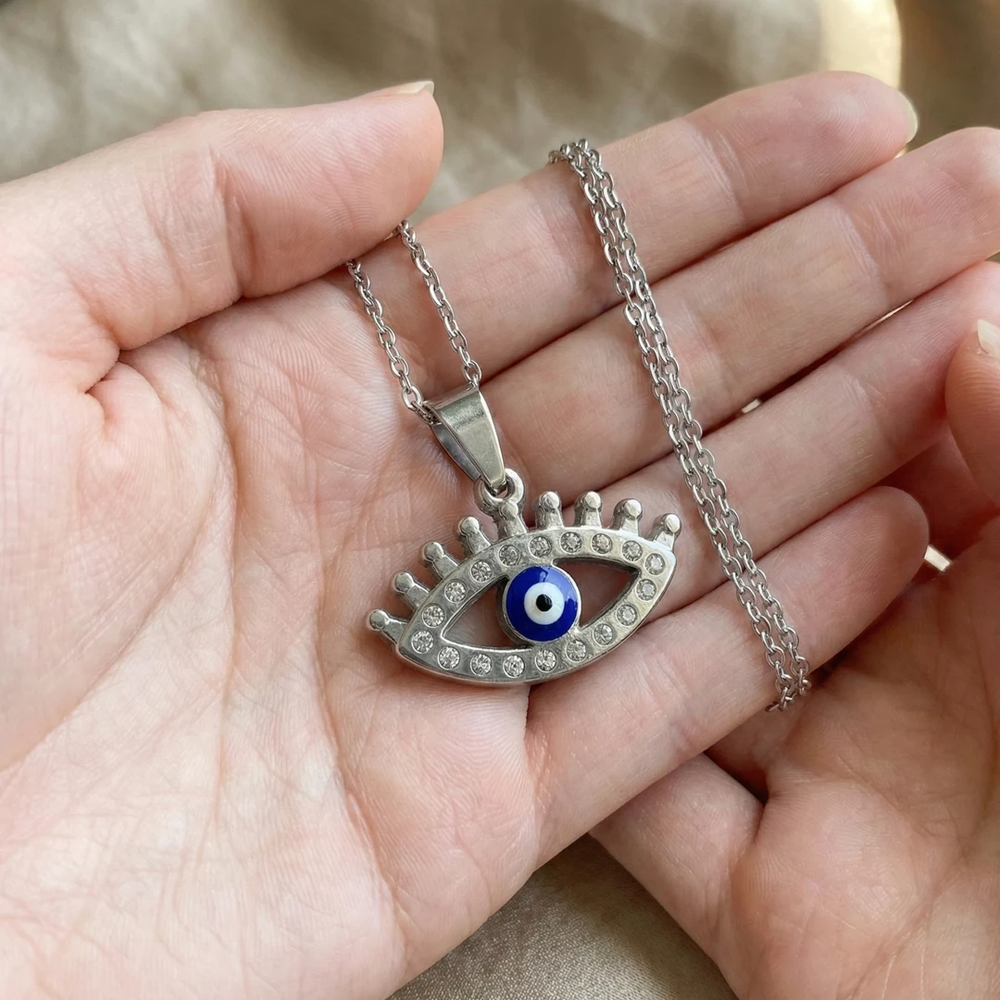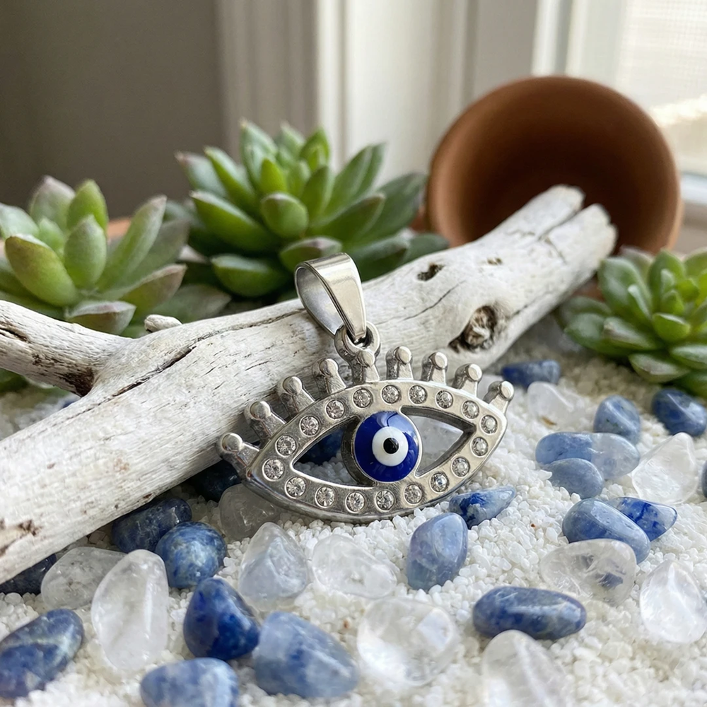 Este dije ojo con strass de acero combina diseño moderno con un fuerte significado simbólico. El ojo, asociado a la protección y la buena energía, se realza con strass brillantes que aportan un toque elegante y llamativo, ideal para quienes buscan un accesorio delicado pero con presencia.