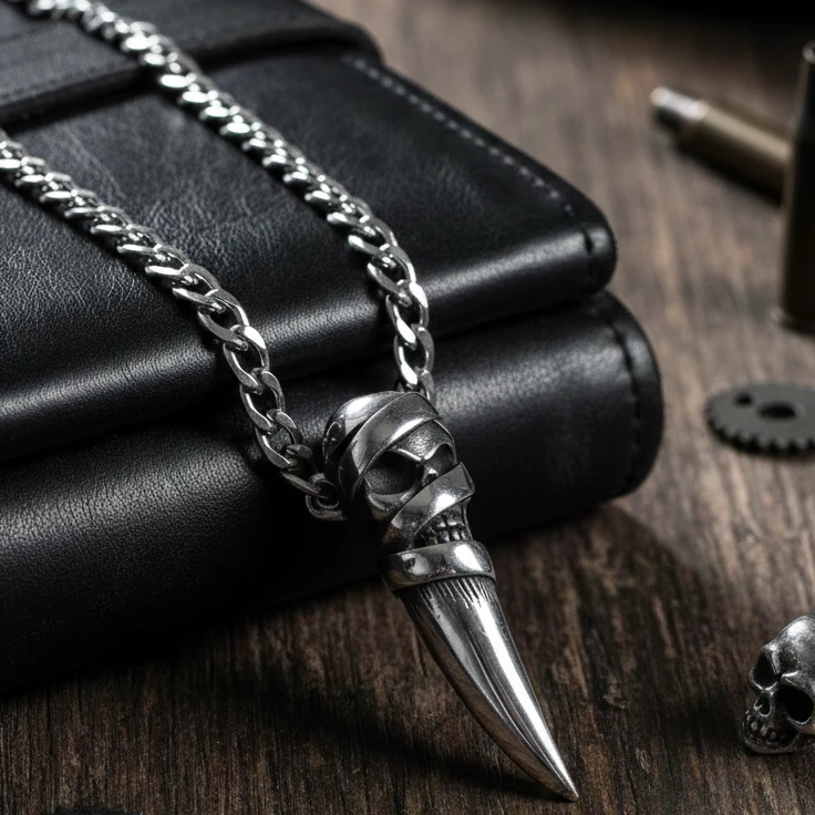 Este impactante dije en forma de colmillo con calavera estilo momia es el accesorio ideal para quienes buscan un look oscuro, rebelde y con fuerte personalidad. Su diseño detallado y agresivo lo convierte en una pieza protagonista, perfecta para destacar en cualquier outfit urbano, rockero o biker.
