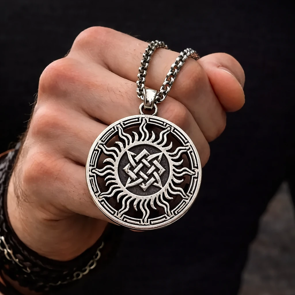 Este dije Svarog combina fuerza simbólica y resistencia superior. Representa al dios eslavo del fuego y la creación, asociado al sol, la energía vital y la protección espiritual. Su diseño circular con rayos solares y símbolo central transmite equilibrio, poder y conexión ancestral, convirtiéndolo en un amuleto ideal para uso diario.