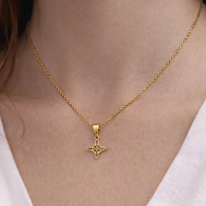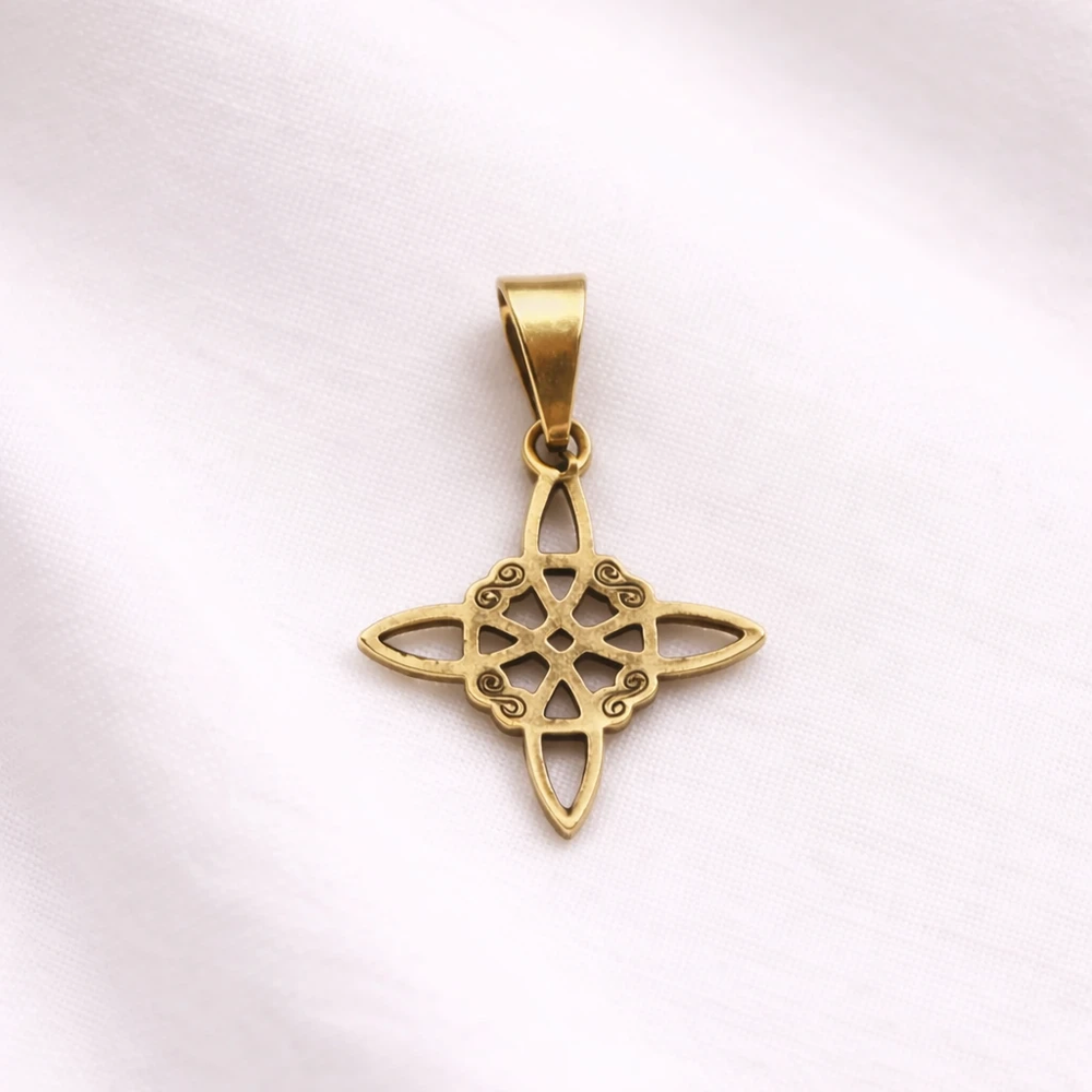 Dije con diseño Nudo de Bruja, símbolo de protección y energía. Terminación dorada, delicado y con excelente nivel de detalle. Un accesorio versátil, fácil de combinar y con muy buena salida comercial. Ideal para uso diario o para regalar.