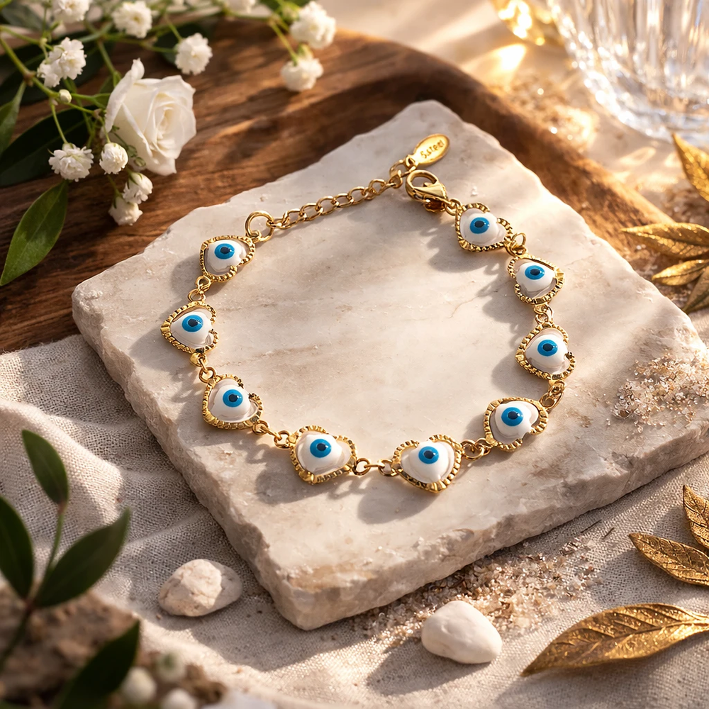 Su diseño armonioso, con pequeños dijes en forma de ojo esmaltados en blanco y azul, crea un equilibrio perfecto entre sofisticación y espiritualidad. Ideal para usar sola o combinar con otras pulseras, aportando un toque moderno y con intención a cualquier look.