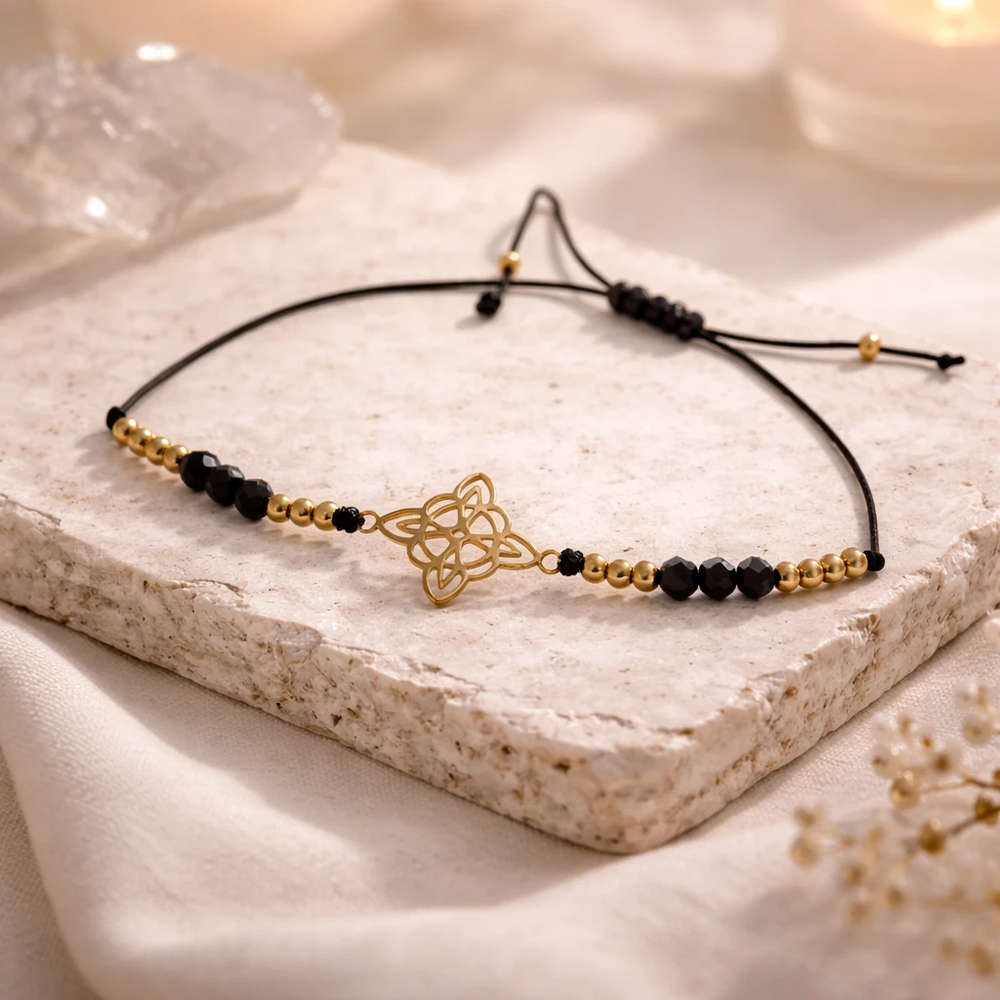 Sutil, elegante y cargada de simbolismo. Esta pulsera de hilo ajustable con dije Nudo de Bruja en tono dorado es el accesorio perfecto para quienes buscan protección y estilo en una sola pieza.