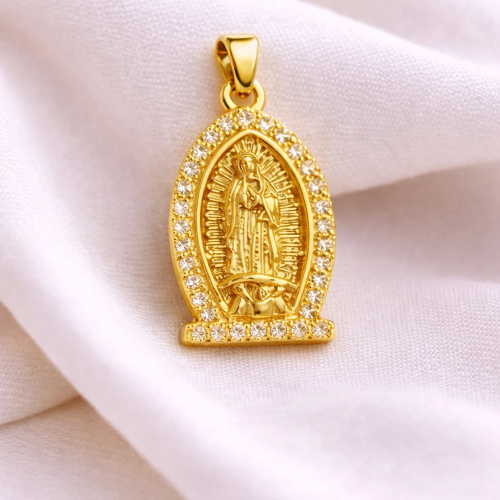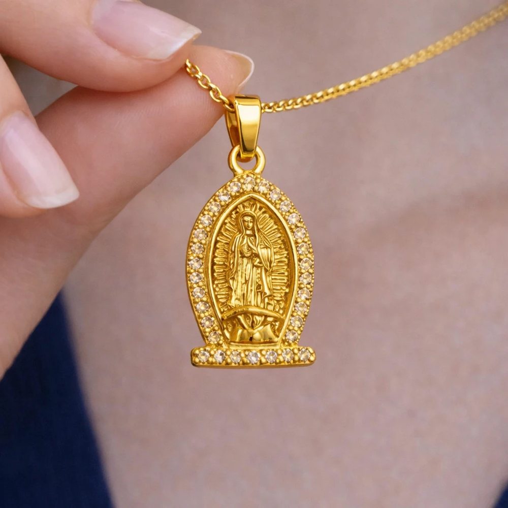 Clásica, elegante y llena de significado, esta medalla de la Virgen de Guadalupe con strass es una pieza infaltable dentro de la joyería religiosa. Su diseño estilizado resalta la figura central rodeada de strass transparentes, que aportan brillo y un acabado delicado, ideal para quienes buscan un accesorio devocional con un toque moderno.