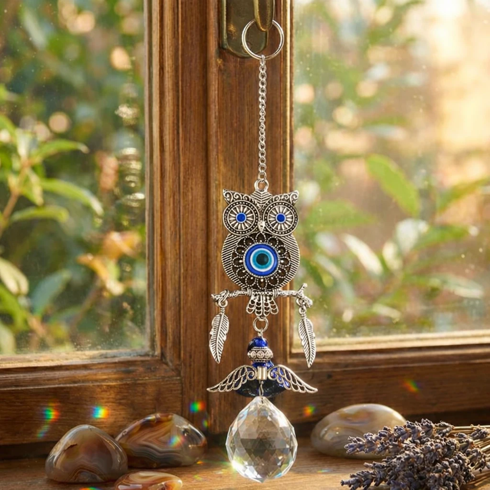 Transformá cualquier espacio con la magia de la luz y el simbolismo protector de este hermoso AtrapaSol con diseño de lechuza. Su delicado trabajo metálico combinado con el intenso ojo turco azul crea una pieza decorativa única que no solo embellece tus ventanas, sino que también aporta una sensación de armonía y protección energética en el ambiente.