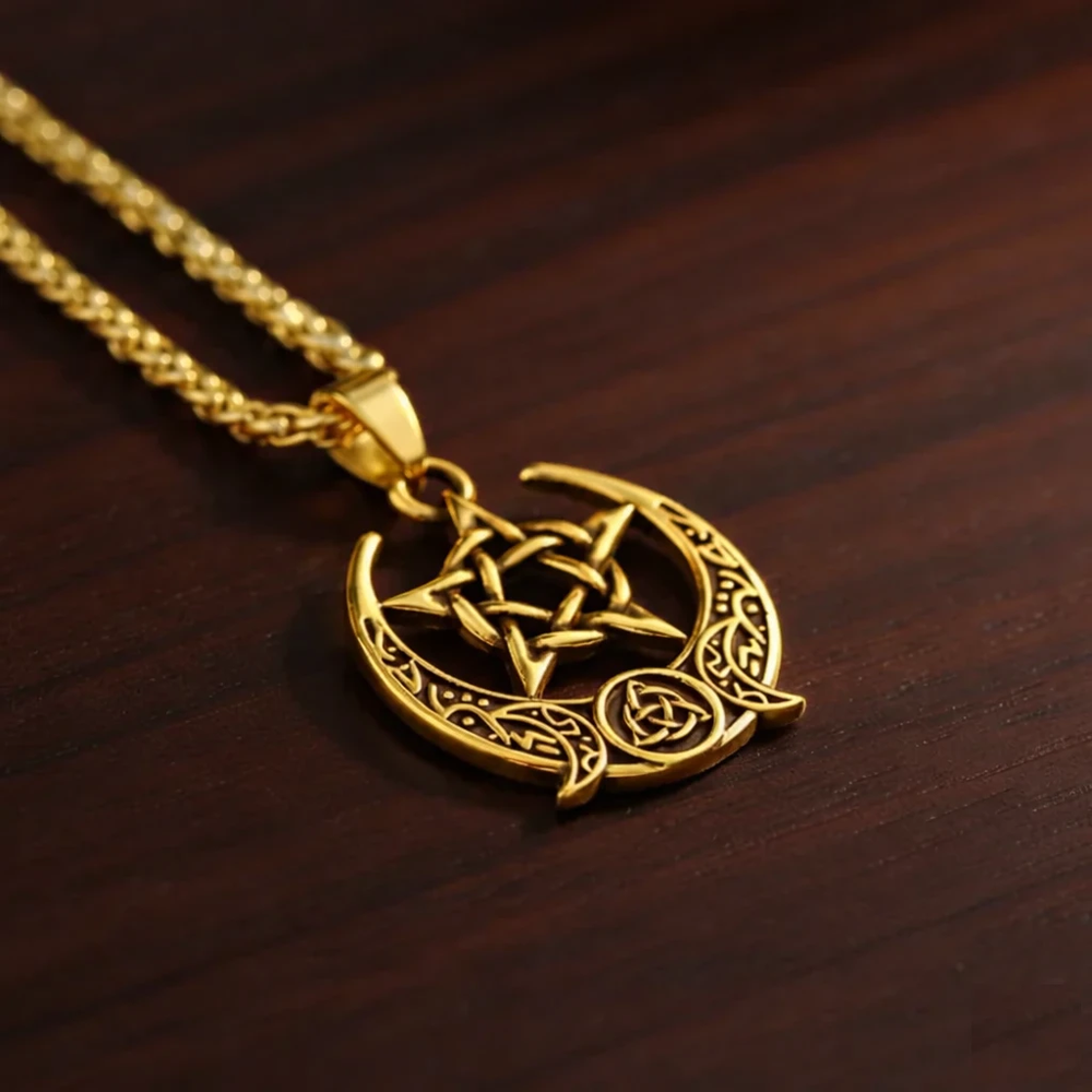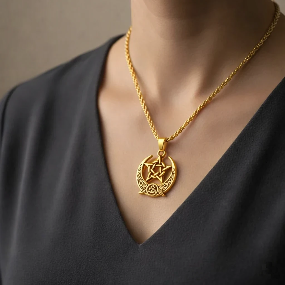 Fabricado en acero quirúrgico dorado, garantiza durabilidad, resistencia y un brillo impecable que no se oxida ni se desgasta. Su diseño detallado y su estilo místico lo convierten en un accesorio ideal para quienes practican espiritualidad, paganismo, Wicca o simplemente admiran la estética esotérica. Un producto de alta rotación en santerías, tiendas esotéricas y locales de accesorios.