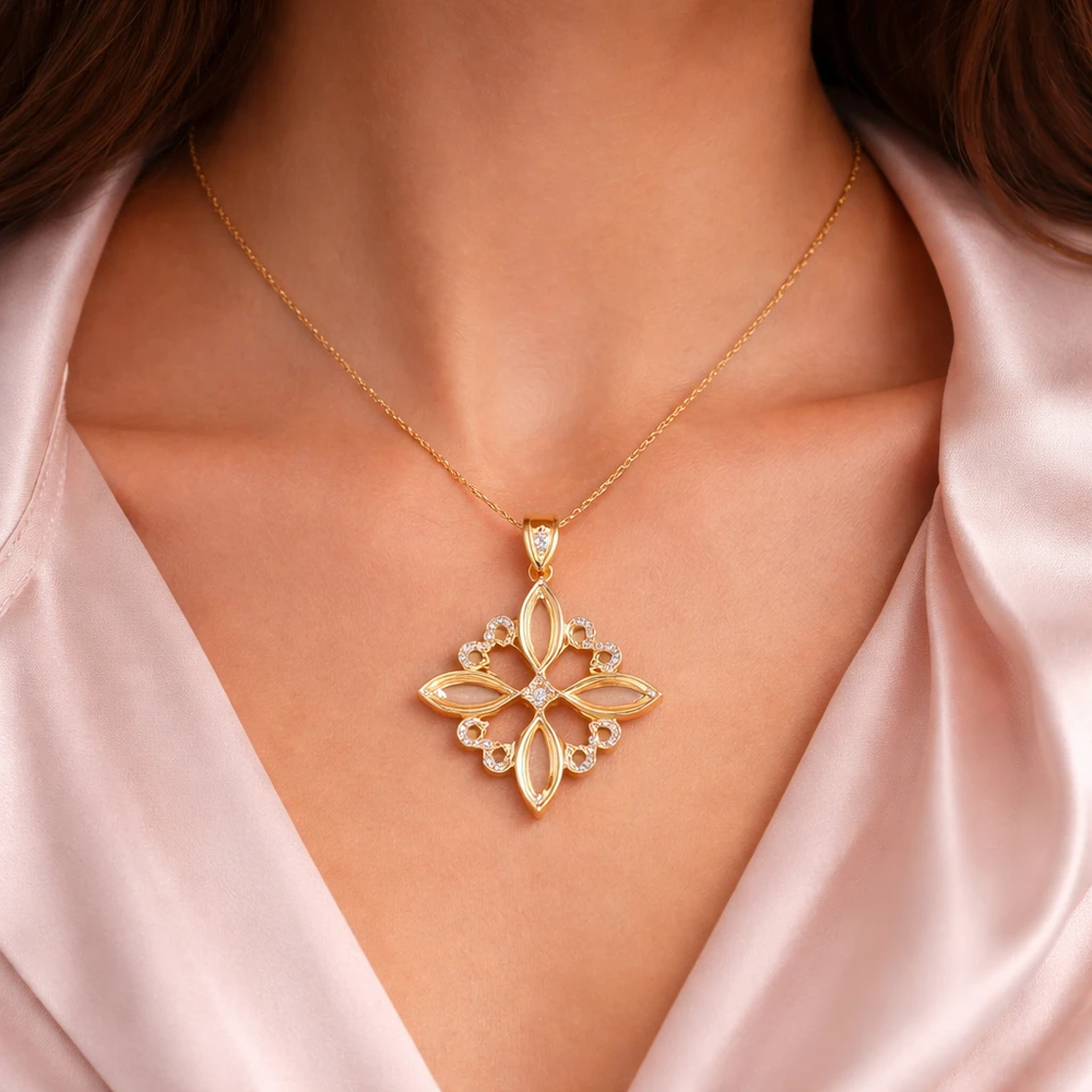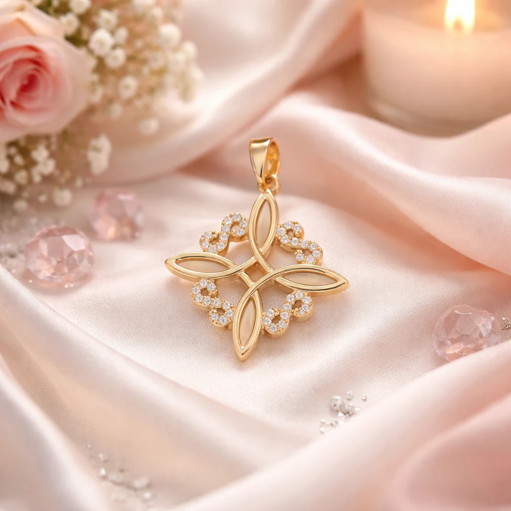 Sumá a tu estilo un símbolo cargado de energía y protección. Este delicado dije con diseño de nudo de bruja combina elegancia y significado espiritual, siendo ideal para quienes buscan atraer buenas energías y mantener el equilibrio interior. Su acabado dorado y detalles con strass le aportan un brillo sofisticado que resalta en cualquier ocasión.