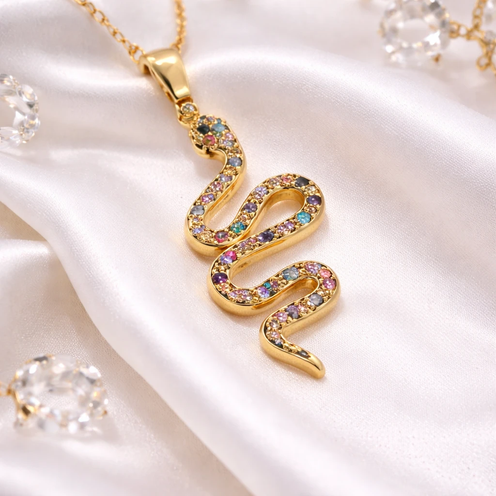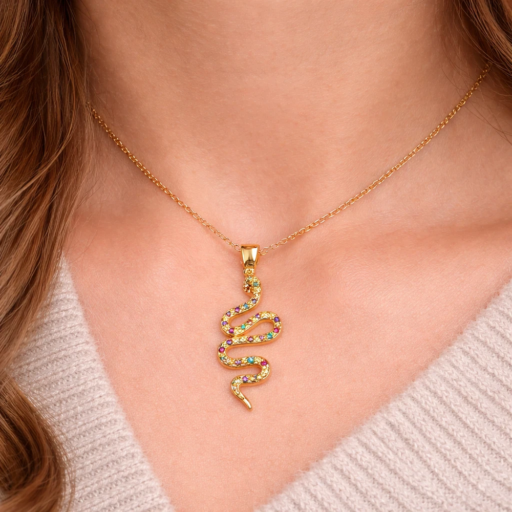 Descubrí el equilibrio perfecto entre elegancia y personalidad con este dije de serpiente en acero quirúrgico dorado, una pieza que no pasa desapercibida. Su diseño sinuoso y delicado, combinado con cristales multicolor, aporta un brillo único que realza cualquier look, desde el más casual hasta el más sofisticado. Ideal para quienes buscan destacar con un accesorio moderno y con carácter.