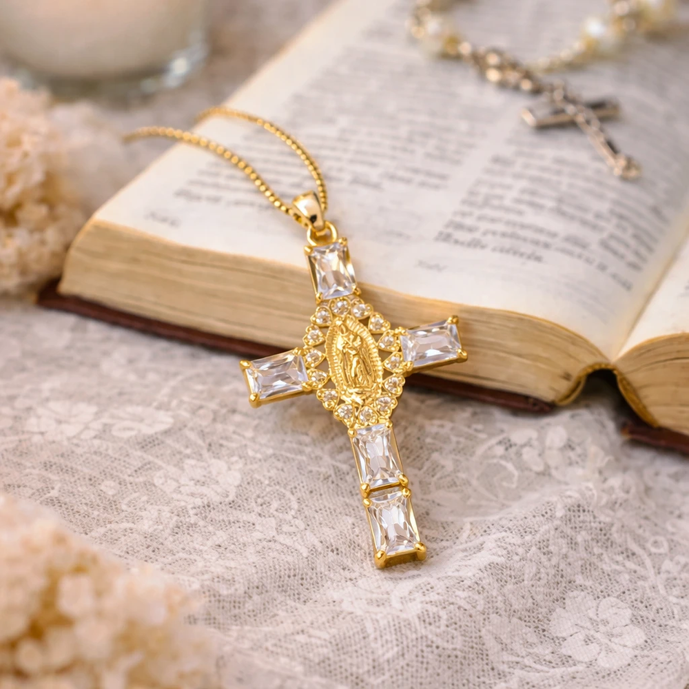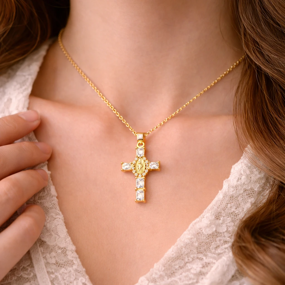 Llevá con vos un símbolo de fe y protección con un diseño moderno y lleno de brillo. Este delicado dije en forma de cruz con la imagen de la Virgen María está cuidadosamente decorado con strass que capturan la luz en cada movimiento, creando un efecto elegante y sofisticado ideal para cualquier ocasión.