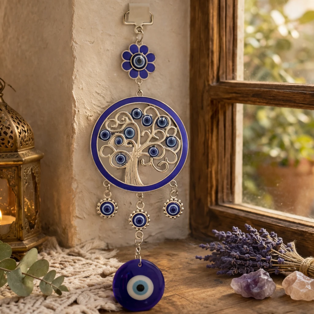 Incluye múltiples ojos turcos (nazares) protectores.