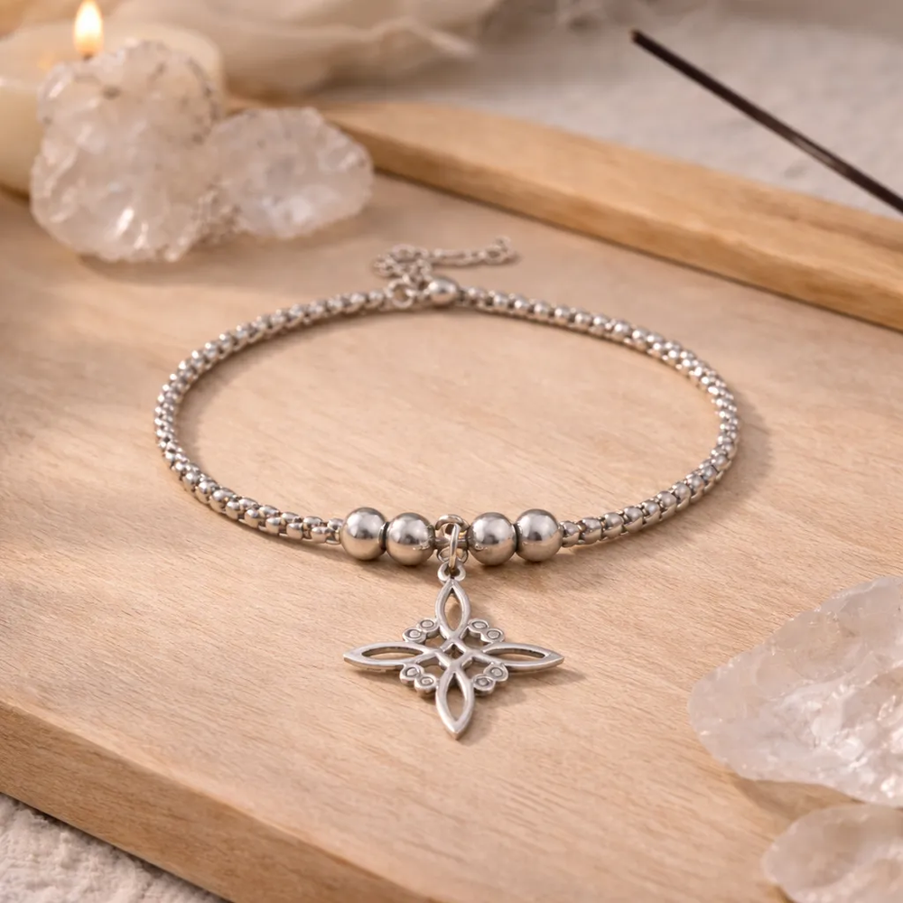 Pulsera elegante y minimalista con dije Nudo de Bruja, símbolo de protección y energía. Su diseño en acero inoxidable color plateado la hace resistente, cómoda y fácil de combinar, ideal para uso diario y reventa mayorista.