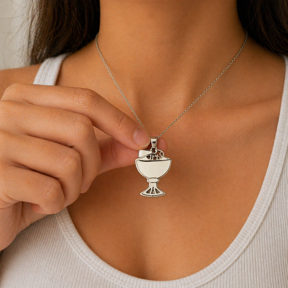 Incorporá a tu catálogo un símbolo cargado de fe y significado con este dije cáliz con hostia (IHS), una pieza ideal para quienes valoran la espiritualidad y las tradiciones religiosas. Su diseño en tono plateado, con líneas limpias y detalles sutiles, representa la comunión y la conexión con lo sagrado, convirtiéndolo en un accesorio especial y lleno de intención.