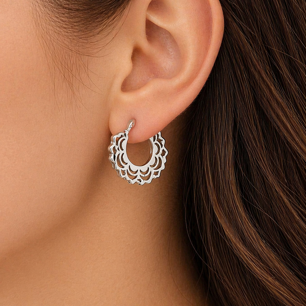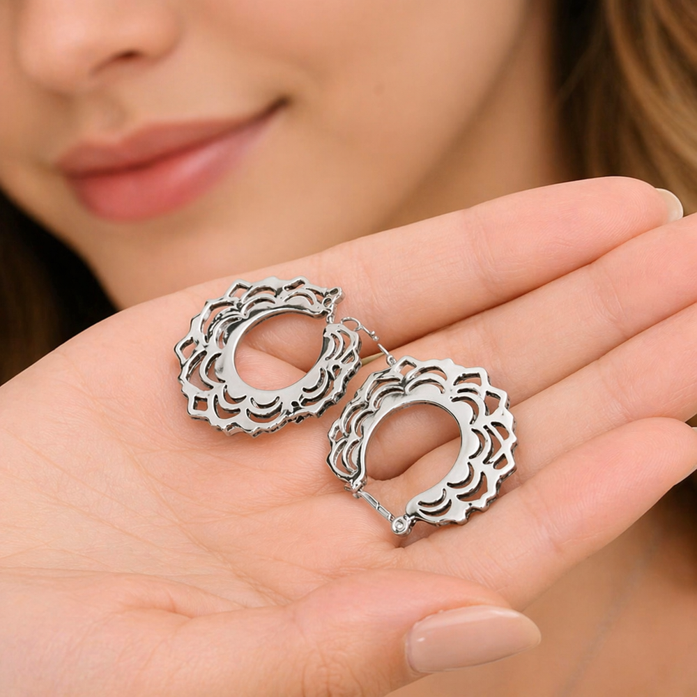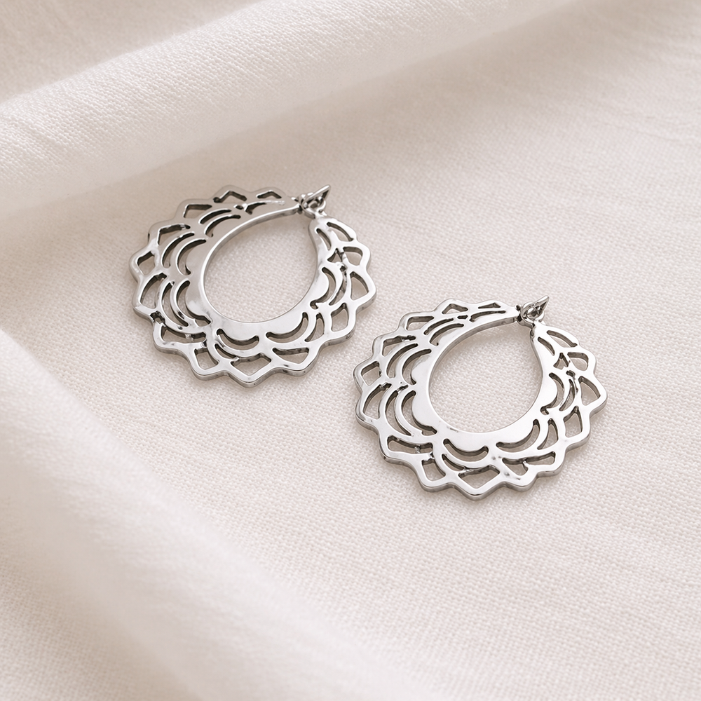 Estos aritos de mandala en acero combinan un diseño calado elegante con la resistencia y durabilidad que buscan las compradoras de hoy. Su acabado plateado aporta un look moderno y sofisticado, ideal para quienes prefieren accesorios versátiles que acompañen cualquier outfit, de día o de noche.